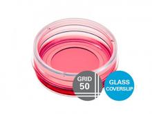 Placa µ-Dish 35 mm, Alta. Grid-50 cristal: Ø 35 mm, pared alta (volumen de 2000 µl), distancia de repetición de la rejilla 50 µm, cubreobjetos de cristal 1.5H (170 µm +/- 5 µm) D 263 M Schott glass. Estéril. Formato: 30 Uds./caja.