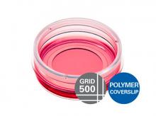 Placa µ-Dish Ø 35 mm, grid-500, pared alta (volumen de 2000 µl), cubreobjetos de cristal 1.5H (170 µm +/- 5 µm) D 263 M Schott glass. Distancia de repetición de la rejilla 500 µm Estéril. Formato: 30 Uds./caja.
